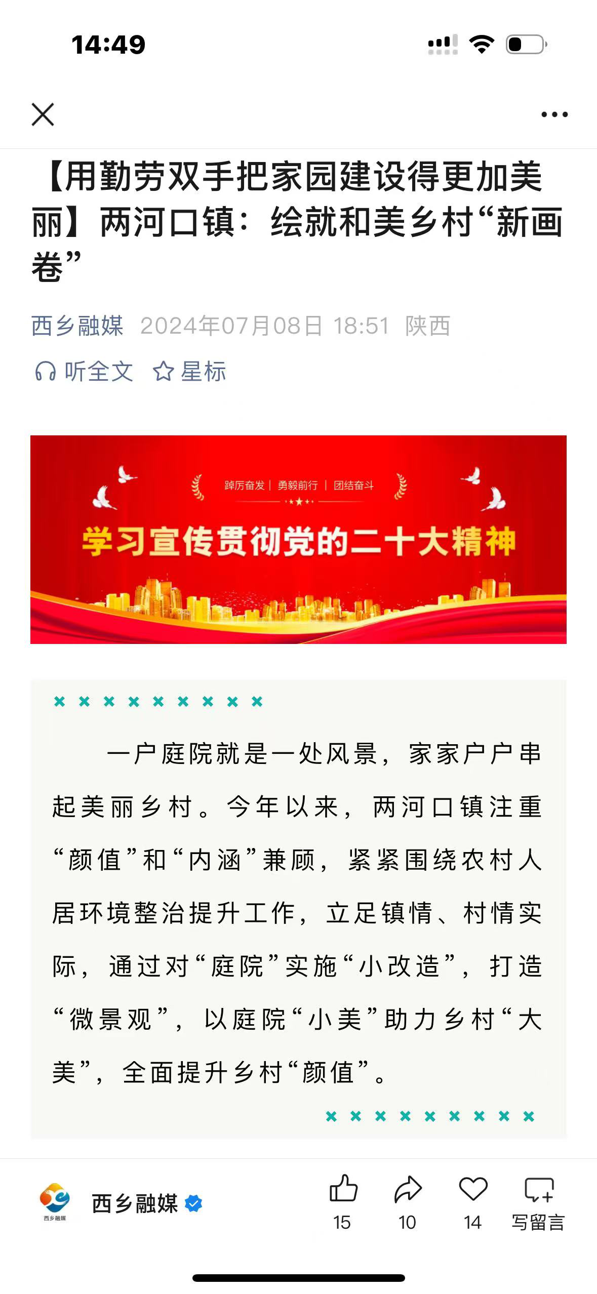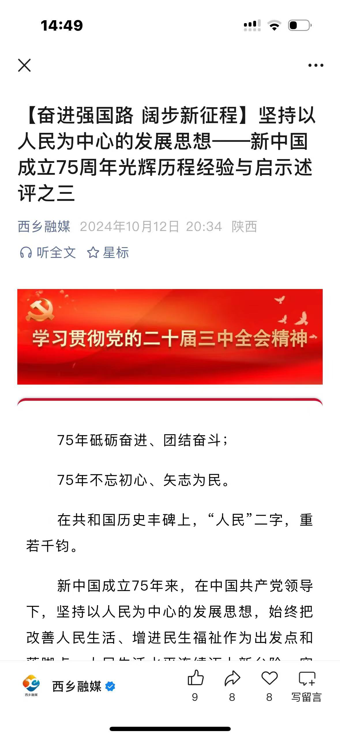 一是坚持正确的政治方向。西乡县融媒体中心以习近平新时代中国特色社会主义思想为指导,深入贯彻落实党的二十大精神和二十届三中全会精神,在电视新闻栏目中开设《学习贯彻党的二十届三中全会精神》专栏,播出新闻5期。在“西乡融媒”微信公众号开设《西乡县各级各部门认真学习贯彻党的二十届三中全会》专栏15期,开设《用勤劳双手把家园建设得更加美丽》专栏11期,集中宣传我县学习贯彻落实习近平新时代中国特色社会主义思想最新成果。开设《奋进强国路阔步新征程》4期、《热烈庆祝中华人民共和国成立75周年》8期,推动学习贯彻落实党的二十大精神和二十届三中全会精神走深走实。