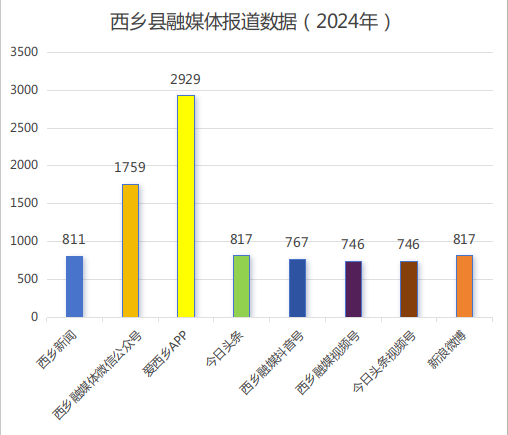 目前,电视栏目《西乡新闻》每周一、三、五播发新闻,全年播出新闻《西乡新闻》156期,811条。“西乡融媒”微信公众号全年推文320期1759条,阅读量123万;爱西乡APP周一至周五推送,全年2929篇;今日头条发稿817篇,微博发稿817条。“西乡融媒”抖音号共发布767条,视频号、今日头条各发布短视频746条。