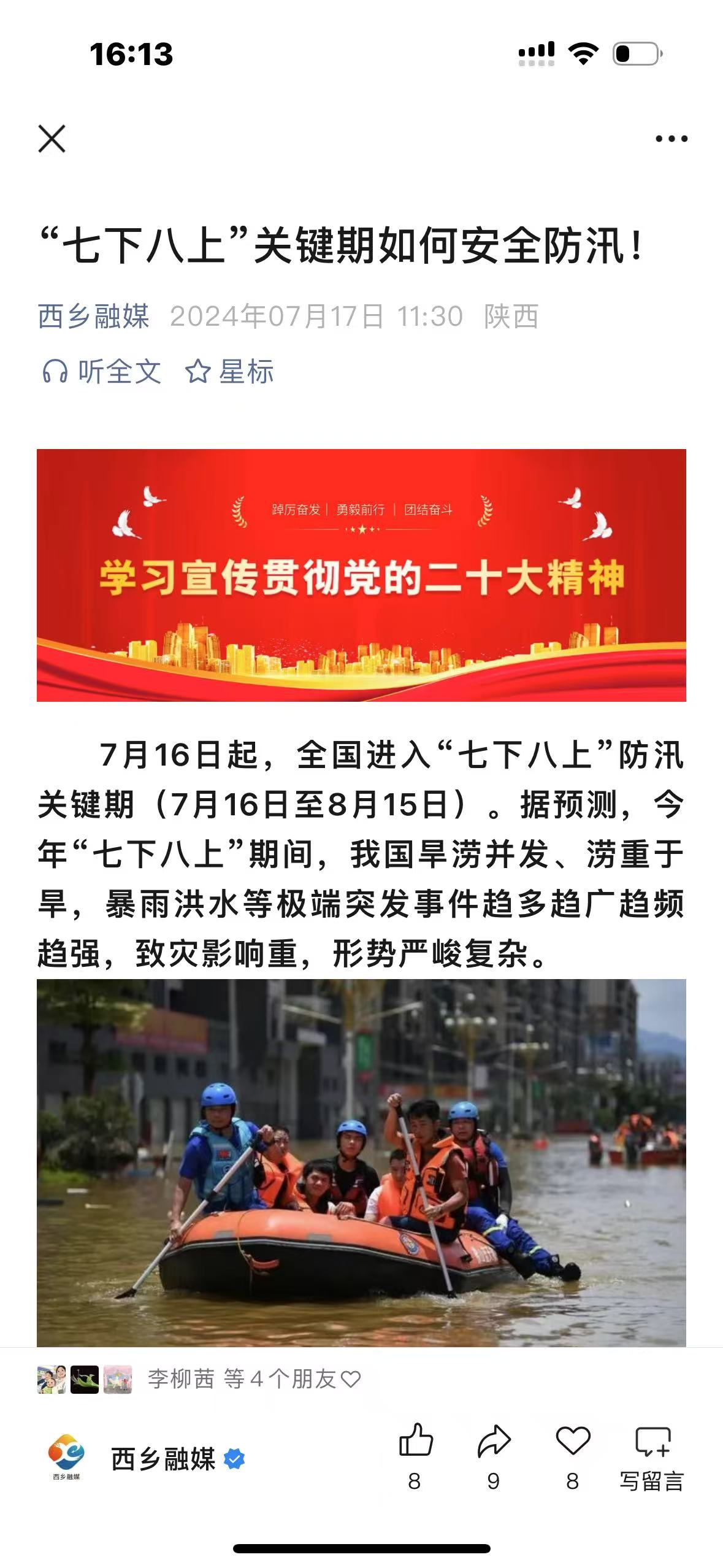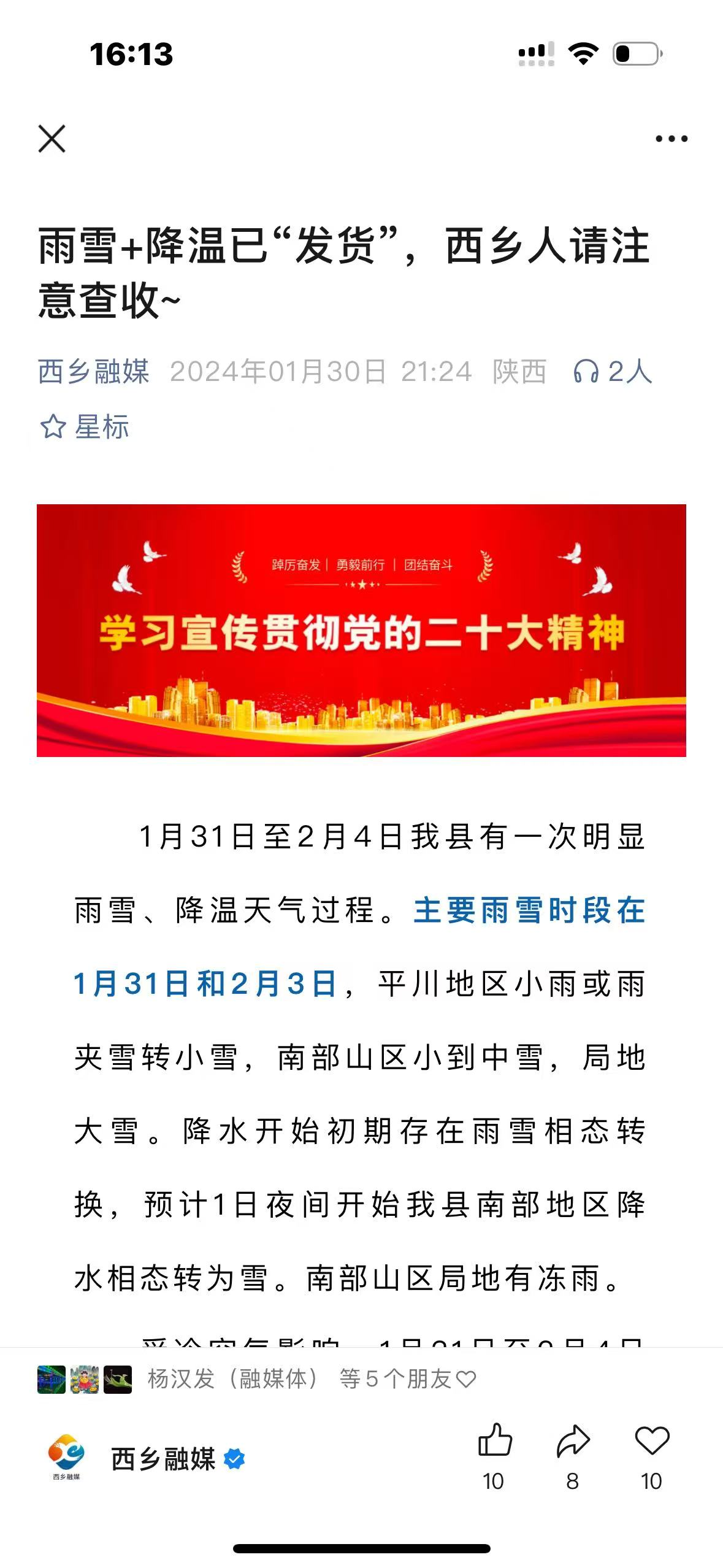 中心结合时间节点,针对西乡县的地域特点,重视防火、汛期、高温等灾害性天气预警,大力开展防火、防溺水、防灾避险宣传,《@西乡人,关于燃放烟花爆竹的危害,请收好这份安全知识!》《“七下八上”关键期如何安全防汛!》《雨雪+降温已“发货”,西乡人请注意查收!》等10余篇针对性报道,提醒群众关注灾害性天气,做好预防措施,农作物做好灾害预警,并提供针对性建议。